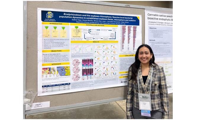Congratulations to Sukhvir K Sarao for being awarded a travel award from the Biology and Microbiology department, which helped towards traveling to Hawaii. Sukhvir presented her recent work on Bradyrhizobium species distribution in soybean soil and rhizosphere at the ASPB 2024 meeting. Held in Honolulu, Hawaii, this marked 100 years of the American Society of Plant Biology.